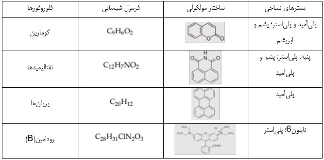 رنگهای فلورسنت رایج کومارینها، نفتالیمیدها، پریلنها و رودامینها هستند. نمونه هایی از رنگهای فلورسنت رایج مورداستفاده برای انتقال فلورسانس به بستر نساجی در جدول نشان داده شده است ]۴[.
