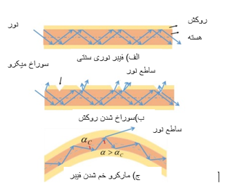 شکل۲.اصل انتشار نور جانبی:(الف)فیبر نوری سنتی.(ب)سوراخ شدن روکش.(ج)مارکرو خم شدن فیبر نوری.