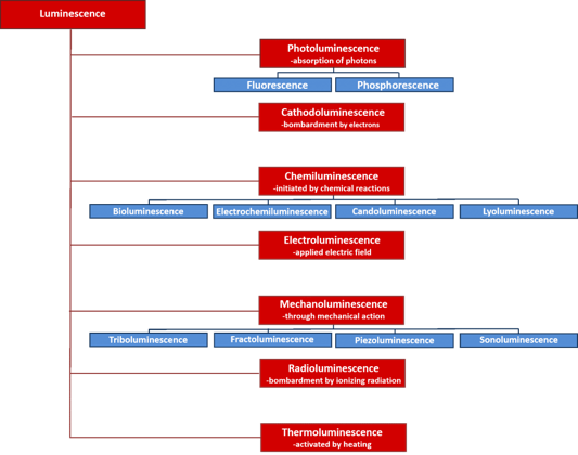 انواع مختلفی از لومینسانس وجود دارد که می توان آنها را بر اساس منبع انرژی که فرآیند لومینسانس را آغاز می کند طبقه بندی کرد. نمای کلی انواع مختلف لومینسانس و منابع انرژی آنها در شکل ۳ نشان داده شده است ]۳[.