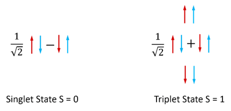 فلورسانس و فسفرسانس بیشتر برای اشاره به نورتابی از سیستم های مولکولی استفاده میشود. الکترونها در مولکولهای پایدار همیشه به صورت جفت وجود دارند، زیرا مولکولهای دارای الکترونهای جفتنشده بسیار واکنشپذیر و ناپایدار هستند. الکترونها دارای یک تکانه زاویهای[۳] ذاتی هستند که به نام «اسپین» شناخته میشود و یک جفت الکترون میتوانند بسته به تقارن نسبی اسپینهای دو الکترون در یکی از دو حالت اسپین کل وجود داشته باشند. اگر دو اسپین در یک پیکربندی ضدمتقارن باشند، جفت الکترون دارای اسپین کل صفر است (S = 0) در حالی که اگر در یک پیکربندی متقارن باشند، جفت دارای اسپین کل یک است (S = 1). همانطور که در شکل ۴ نشان داده شده است یک ترکیب از حالتهای جفت اسپین الکترون وجود دارد که ضدمتقارن است و سه ترکیب از حالتهای جفت اسپین که متقارن هستند و حالت های S = 0 و S = 1 بهترتیب منفرد و سه گانه نامیده میشوند ]۹[.