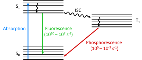 هنگامی که یک فوتون توسط مولکول جذب میشود، یکی از الکترونها به سطح انرژی بالاتری ارتقا مییابد و مولکول اکنون در حالت برانگیخته است. حالت پایه یک مولکول (تقریباً) همیشه یک حالت منفرد (S0) است و بهدلیل حفظ تکانه زاویه ای حالت برانگیخته با نور نیز باید یک تک (S1) باشد. همانطور که در نمودار جابلونسکی[۴] زیر نشان داده شده است. واپاشی حالت S1 به S0 یک انتقال مجاز است (زیرا هر دو حالت دارای تعدد اسپین یکسان هستند) که منجر به فوتولومینسانس فوری میشود که در مقیاس زمانی پیکوثانیه[۵] تا نانوثانیه[۶] رخ میدهد و فلورسانس نامیده میشود ]۹[.