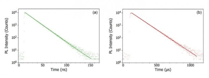 ۹-آمینوآکریدین که طول عمر ۱۶ نانو ثانیه دارد و (ب) واپاشی فسفرسانس محلول Eu2O3 که طول عمر ۱۲۰ میکرو ثانیه دارد. با استفاده از طیف سنج فوتولومینسانس FLS1000 اندازهگیری شد ]۱۰[.