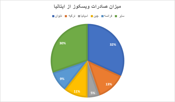 صادرات: شریک صادراتی اصلی ایتالیا برای ویسکوز، تایوان است که ارزش صادرات آن ۳/۴/ میلیون دلار است. این نشان میدهد که بخش قابل توجهی از صادرات ویسکوز ایتالیا به سمت بازارهای تایوان هدایت میشود. سایر مقاصد صادراتی عبارتند از ترکیه (۶/۱ میلیون دلار)، چین (۴/۱ میلیون دلار)، فرانسه (۱/۱ میلیون دلار) و اسپانیا (۷/۰ میلیون دلار).