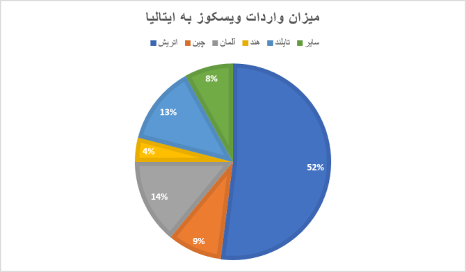 واردات: ایتالیا ویسکوز را عمدتاً از اتریش وارد میکند، که نشان دهنده وابستگی شدید به ویسکوز اتریشی با واردات به ارزش ۶/۳۶ میلیون دلار است. دیگر شرکای اصلی واردات شامل آلمان (۹/۹/ میلیون دلار) و تایلند (۱/۹ میلیون دلار) هستند.