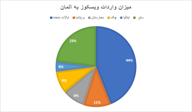 با توجه به جدول و شکل ۴ تجارت ویسکوز در آلمان حضور صادراتی قابل توجهی را نشان میدهد و ایالات متحده با ۸/۷۴ میلیون دلار به عنوان شریک اصلی صادرات محسوب میشود. بریتانیا، مجارستان و جمهوری چک نیز به ترتیب با ۳/۱۹ میلیون دلار، ۹/۱۵ میلیون دلار و ۱۵.۳ میلیون دلار در رتبههای بعدی قرار دارند. ایتالیا، اگرچه به میزان کمتری، با ۹/۵ میلیون دلار یک شریک صادراتی مهم آلمان محسوب میشود. از نظر واردات، چین با ۴/۹ میلیون دلار واردات ویسکوز به آلمان پیشتاز است و اندونزی با ۷/۷ میلیون دلار بعد از آن قرار دارد. هلند و تایلند به ترتیب با ۵/۲ و ۷/۱ میلیون دلار به عنوان شرکای وارداتی قابل توجهی بهشمار میآیند. هند نیز با ۵/۱ میلیون دلار از بازار واردات به این کشور سهم دارد. آمار مجموعه متنوعی از شرکای تجاری آلمان را در بازار ویسکوز با مقادیر متفاوت واردات و صادرات نشان میدهد.