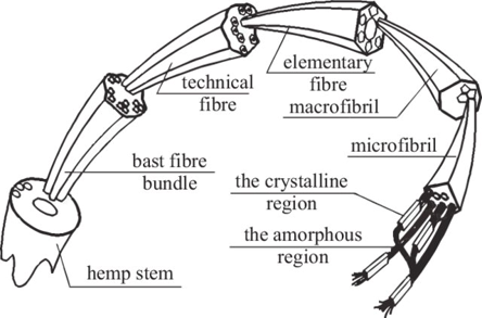 الیاف شاهدانه مانند کتان یا گزنه به عنوان الیاف پایه در نظر گرفته میشوند که از دستههایی تشکیل شدهاند که در امتداد طول گیاه قرار میگیرند و گردهها را احاطه کردهاند که هسته چوبی ساقه محسوب میشوند. همه اینها توسط یک لایه نازک به نام اپیدرم پوشیده شدهاست که به آن پوست نیز میگویند (شکل ۳). الیاف شاهدانه از چندین لایه ساخته میشوند، لایه اول دیواره اصلی است که متشکل از سه لایه میباشد و یک لایه میانی که به خواص مکانیکی فیبر شکل میدهد و در طول رشد سلولی ایجاد میشود. لایه دوم یا لایه میانی در یک زنجیره سلولزی بلند قرار دارد که حاوی بین ۳۰ تا ۱۰۰ مولکول میکروفیبریل است و به الیاف استحکام مکانیکی میدهد. این سلولز مطلوبترین جزء است، بنابراین استحکام و انعطافپذیری الیاف را تضمین میکند. همچنین وجود همی سلولز وجود دارد که سلولز و لیگنین را به یکدیگر متصل میکند. افزون بر این، سختی دیواره سلولی را افزایش داده و از تخریب آن جلوگیری میکند. در نهایت، پکتین در لایه میانی در بین انواع سلولی وجود دارد که همه اجزا را در کنار هم نگه میدارد، بنابراین حذف آن برای آزاد کردن الیاف سلولزی اهمیت دارد. تمام این ترکیبات شیمیایی مختلف کل ساختار فیبر شاهدانه را تشکیل و درصد مشخصی از خود فیبر را نشان میدهند. متداولترین این ترکیبات، سلولز است که ۵۲ تا ۷۸ درصد وزن را تشکیل میدهد، به دنبال آن همیسلولز با محتوای ۱۴ درصد تا ۲۲ درصد و لیگنین و پکتین به عنوان مولکولهای قابل توجه باقی مانده در الیاف پایه، به ترتیب بین ۳% و ۱۰% و ۰.۶% و ۱۰% از این ترکیبات را تشکیل میدهند. برای تعیین چنین درصدهایی، از تکنیکهای مختلفی استفاده میشود که عمدتاً بر تجزیه و تحلیلهای مخرب الیاف سلولزی منتج میشود. بنابراین، روشهایی مانند کروماتوگرافی مایع با کارایی بالا همراه با طیفسنجی جرمی، تکنیکهای خوبی هستند که امکان تجزیه و تحلیل مخلوطهای پیچیده را با حساسیت زیاد فراهم میکنند. روشهای جایگزین مانند پیرولیز چند شات همراه با کروماتوگرافی گازی و طیفسنجی جرمی یا تجزیه و تحلیل گاز تکاملی همراه با طیفسنجی جرمی، تکنیکهای امیدوارکننده دیگری هستند که میتوانند برای تعیین ساختار الیاف سلولزی مورد استفاده قرار گیرند. مقادیر نشانداده شده و بهدستآمده با روشهای مختلف برای شاهدانه، ارتباط نزدیکی با ترکیب شیمیایی نشانداده شده برای سایر الیاف پایه، مانند کتان یا جوت دارد، بنابراین ارتباط احتمالی بین کاربردهای مشابه و مورفولوژی آنها را نشان میدهد. علاوه بر این، بر اساس ترکیب شیمیایی، شاهدانه به عنوان یک الیاف سلولزی شناخته میشود، به این معنی که فرآیندهای استخراج پس از الیاف، مانند پیش تصفیه، رنگرزی، و تکمیل، مشابه ر سایر الیاف سلولزی رایج مانند پنبه یا کتان انجام میشوند. بنابراین، میتوان از همان مواد شیمیایی مانند سود سوزآور، پراکسید اکسیژن و رنگدانههای مشابه در برخی مراحل استفاده کرد، اما ممکن است در برخی موارد به دلیل وجود بیشتر ترکیباتی مانند لیگنین، غلظتهای بالاتر مورد نیاز باشد که منجر به نیاز به یک پیش از تکمیل قویتر خواهد شد.