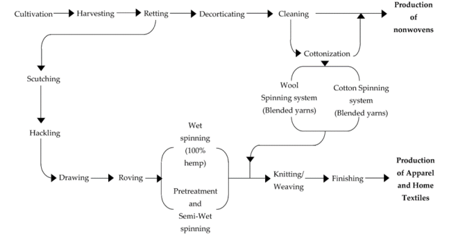 پس از استخراج الیاف، که در شکل ۲ قابل مشاهده است، مراحل بعدی، همانطور که قبلا ذکر شد، به کاربرد نهایی بستگی دارد. برای کاربردهای پوشاک و منسوجات خانگی، که در آن تعداد مراحل بیشتری مورد نیاز است و فرآیند ریسندگی به نوع کاربرد و خواص الیاف بستگی دارد، روند متفاوت خواهد بود. الیاف بلند کتان و شاهدانه معمولاً بهترین کیفیت لیف را دارند؛ اگرچه برای این کار فرآیندهای ریسندگی خاصی مورد نیاز است، یعنی فرآیندهای ریسندگی مرطوب یا نیمه مرطوب، که امکان تولید نخ شاهدانه ۱۰۰٪ را فراهم میکند. با توجه به فرآیند ریسندگی نیمه مرطوب، پیش تصفیه رووینگ مورد نیاز است. در هر دو حالت امکان آمیختگی با الیاف کتان نیز وجود دارد. علاوه بر این، از طریق پنبهسازی الیاف شاهدانه، همانطور که در شکل بعدی نشان داده شده است، میتوان از سیستمهای ریسندگی حلقه و روتاری استفاده کرد که ترکیب الیاف شاهدانه را با انواع دیگر الیاف امکانپذیر میسازد. اما به طور معمول با استفاده از این سیستمها نمی توان نخ شاهدانهی ۱۰۰ درصد را بهدست آورد. در نهایت، امکان استفاده از سیستمهای پشم برای تولید نخهای ترکیبی شاهدانه/پشم وجود دارد. برای حصول این الیاف، الیاف شاهدانه باید دکوراتیکیزه شوند، اما همچنین باید از یک دستگاه کاردینگ خاص عبور کنند، که منجر به تولید الیاف شاهدانهی پشم-مانند شوند. از طریق این سیستم ریسندگی میتوان به نخ های ۹۰ درصد شاهدانهی دست یافت.