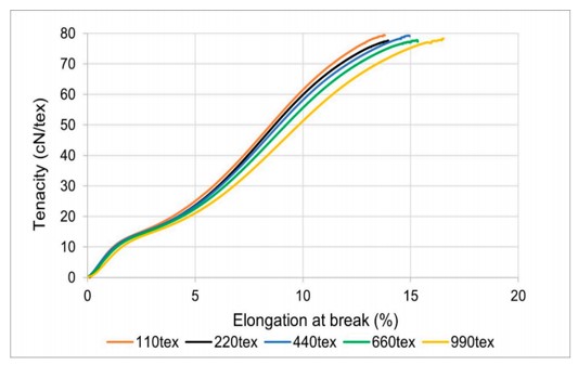نتیجه آزمایش استحکام کششی نخ های پلیاستر قبل از فرآیند ایجینگ نشان میدهد که افزایش نمره نخ تأثیر قابل توجهی بر استحکام نخ نداشته است. منحنی تنش-کرنش نیز نشان میدهد که تمامی نمونههای آزمایش شده رفتار مشابهی در محدوده الاستیک منحنی داشتند. با این حال، در محدوده پلاستیک منحنی، نمونه نخ با چگالی خطی کمتر درصد ازدیاد طول کمی کمتری را نشان داد. افزایش چگالی خطی نخ باعث افزایش درصد ازدیاد طول شد. با این حال، تفاوت درصد ازدیاد طول در نمونههای نخ ناچیز است.