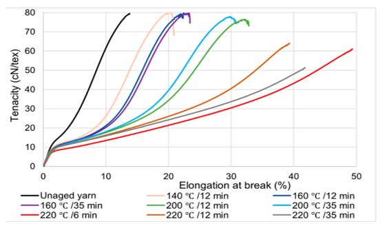 نتایج نشان میدهد که نخی که در دمای بالاتر و زمان ایجینگ کمتر (دمای ۲۲۰ درجه سانتیگراد به مدت ۶ دقیقه) حرارت دیده است، در مقایسه با نمونه نخ اولیه، تقریباً پنج برابر ازدیاد طول بیشتری در نقطه گسیختگی نشان میدهد. نخ اولیه در مقایسه با نمونههایی که در دمای بالاتر از ۲۰۰ درجه سانتیگراد قرار داشتند، استحکام نسبتا بالایی داشت. این پدیده نشان میدهد که قرار گرفتن نخهای ترموپلاستیک پلی استر در معرض دمای بالاتر باعث تخریب ساختار الیاف میشود.