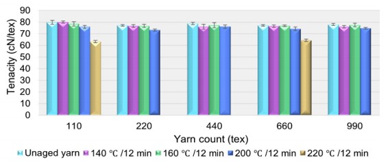 تأثیر دما بر استحکام نخ پلیاستر در مدت زمان ثابت بررسی شد. ایجینگ حرارتی نخ در دمای ۲۲۰ درجه سانتیگراد برای نمونههای ۱۱۰ تکس و ۶۶۰ تکس انجام شد. همانطور که در شکل۳ نشان داده شده است، نتیجه نشان میدهد که هنگامی که نخها در معرض دمای ایجینگ از ۱۴۰ تا ۲۰۰ درجه سانتیگراد به مدت ۱۲ دقیقه قرار میگیرند، تغییر ناچیزی در استحکام نخ مشاهده میشود، صرف نظر از تغییر در چگالی خطی نخ. با این حال، با افزایش دمای ایجینگ به ۲۲۰ درجه سانتیگراد، کاهش استحکام ۲۰/۸۴%در مقایسه با نمونه اولیه مشاهده شد.