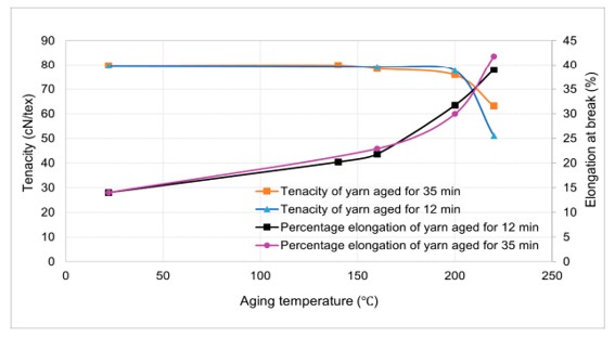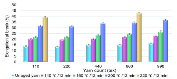 برخلاف استحکام نخ، تغییر قابل توجهی در درصد ازدیاد طول در نقطه گسیختگی با افزایش دمای ایجینگ در حالی که مدت زمان ثابت بود، مشاهده شد. بسیاری از محققان نشان دادهاند که ایجینگ حرارتی نخ پلیاستر، بالاتر از دمای انتقال شیشهای و پایینتر از نقطه ذوب، منجر به اصلاح ساختار داخلی نخ میشود که این امر به طور چشمگیری خواص مکانیکی نخ را تغییر میدهد. ایجینگ حرارتی نخ در دمای ۲۲۰ درجه سانتیگراد فقط برای نمونههای ۱۱۰ تکس و ۶۶۰ تکس انجام شد.
