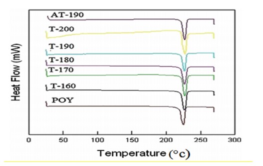 رفتار حرارتی نمونهها در جدول ۲ و شکل ۶ نشان داده شده است. همانطور که در جدول ۲ مشاهده میشود، با افزایش دمای تثبیت اولیه از ۱۶۰ درجه سانتیگراد به ۲۰۰ درجه سانتیگراد، درصد کریستالی بودن نخ تکسچره شده کاهش یافت. تبلور نخ تکسچره شده در دماهای ۱۶۰ و ۱۷۰ درجه سانتی گراد بیشتر از نخ POY است. با این حال، تبلور نخ تکسچره شده در دماهای ۱۸۰، ۱۹۰ و ۲۰۰ درجه سانتیگراد کمی کمتر از نخ POY بود. در مورد نخ POY که ابتدا ایجینگ شده و سپس تکسچره شده، به نظر میرسد که درصد بلورینگی تقریباً برابر با نخ بدون ایجینگ و تکسچره در دمای ۱۹۰ درجه سانتیگراد باشد. POY در طول فرآیند تکسچرایزینگ در معرض نیروهای اعمال شده خارجی و تنش داخلی قرار میگیرد. نیروهای اعمال شده از بیرون نیروی کششی است و نیروهای پیچشی نخ( twist) به معنای پیچش و خمشی است که این نیروها مانند حالت پایداری حرارتی به فیلامنت ها اجازه نخواهند داد که بلورینگی ایجاد شود. این به این دلیل است که کشش ساده به تشکیل یک شبکه کریستالی کمک می کند، در حالی که خمش و پیچش باعث اختلال در شبکه کریستالی میشود.