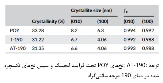 جدول ۳- درصد بلورینگی، اندازه کریستال و تابع جهت گیری برای نخ POY