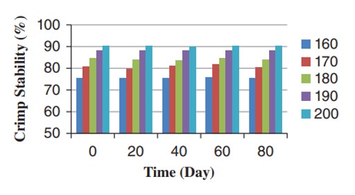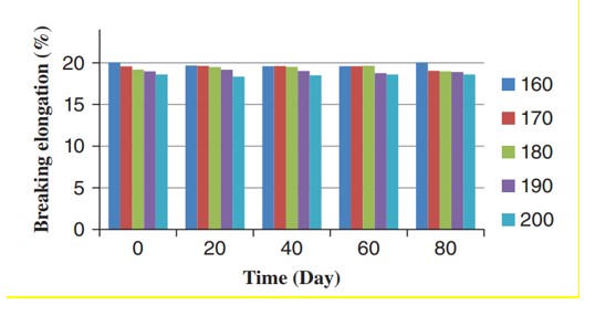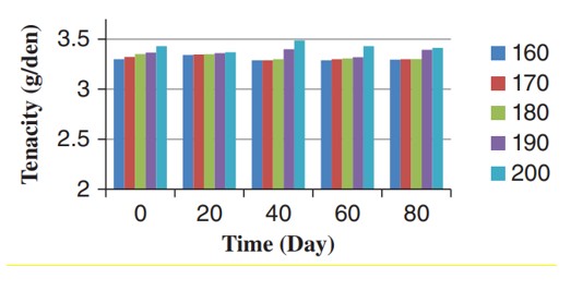 خواص فیزیکی نمونه های POY و تکسچره شده در جدول ۴ آمده است. استحکام نخ های تکسچره شده در دماهای مختلف اولین تثبیت به مدت ۸۰ روز در شکل ۸ نشان داده شده است. آنالیز ANOVA دوطرفه نشان داد که افزایش دما تأثیر مهمی بر استحکام نخ دارد. تغییر ازدیاد طول در نخ های تکسچره شده در دماهای مختلف اولین تثبیت در طول ایجینگ در شکل ۹ نشان داده شده است. آنالیز واریانس دو طرفه نشان داد که افزایش دما تأثیر مهی بر ازدیاد طول تا حد پارگی نخ دارد. مهم ترین عامل برای تعیین استحکام الیاف جهت گیری است که با شکست دوگانه بدست می آید. کاراکاس نشان داد که با افزایش دمای تثبیت اول به ۲۰۰ درجه سانتیگراد، ازدیاد طول تا حد پارگی نخ تولید شده از الیاف نایلون ۶۶ کاهش و استحکام آن افزایش یافت. اما در دماهای ۲۱۰ و ۲۲۰ درجه سانتی گراد مقاومت نخ کاهش یافت. مطالعه پوپوویچ نشان داد که استحکام و کشیدگی شکستن نخ نایلونی بافت ۶۶ حتی پس از ۲۱ ماه نگهداری در محدوده مجاز است.