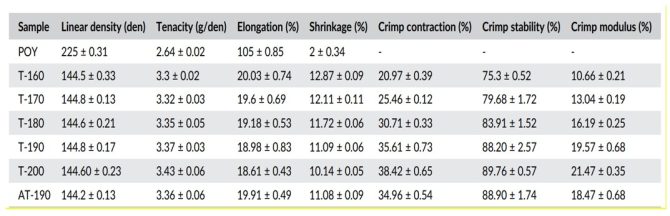 جدول ۴- مقادیر میانگین خواص فیزیکی نخ POY و تکسچره شده در محدوده ۲۰۰-۱۶۰ درجه سانتی گراد