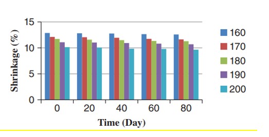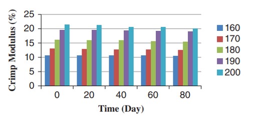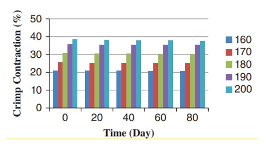 اثر ایجینگ نخهای تکسچره شده در دماهای مختلف تثبیت حرارتی بر جمع شدگی نخ در شکل ۱۰ نشان داده شده است. نتایج آنالیز واریانس دو طرفه نشان داد که اثر دما بر جمع شدگی نخ مهم بود. مطالعات Canoglu نشان داد که با افزایش دمای اولین تثبیت حرارتی، میزان جمع شدگی نخ PET کاهش پیدا میکند. علاوه بر این، آنالیز واریانس دوطرفه نشان داد که ایجینگ اثر قابل توجهی بر جمع شدگی نخ دارد. خواص چین خوردگی نخ های تکسچره شده در دماهای مختلف اولین تثبیت و زمان ایجینگ ۸۰ روزه در شکلهای ۱۲-۱۱ نشان دادهشدهاست. افزایش دمای تثبیت به طور قابل توجهی باعث افزایش جمعشدگی چین خوردگی، مدول و ثبات چین خوردگی ها شد.