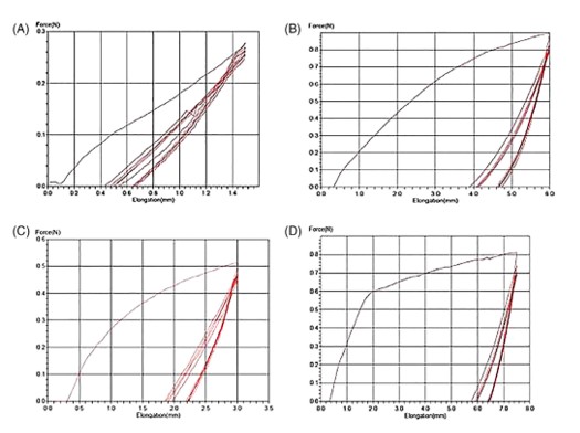 شکل ۱۴- بازیابی الاستیک فوری فیلامنتPBT در طول پنج سیکل بارگذاری-حذف بارگذاری(A)5%, (B)10%, (C)20%, (D)25% ازدیاد طول طول