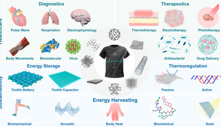 نانولولههای کربنی، اجزای روشنکننده، ترموکوپلها یا مواد حافظهدار را میتوان در انواع کاربردهای حسگر در زمینههای مختلف از جمله منسوجات پیشرفته استفاده کرد. مواد کرومی را می توان به منظور پایش آلودگی محیطی و تشخیص در پزشکی استفاده کرد زیرا محرکها توانایی تغییر خواص نوری آنها را دارند. در این زمینه، سنسورهای pH هالوکرومیک برای شناسایی محیطهای قلیایی یا اسیدی در ارزیابی سطوح آلودگی، کیفیت غذا و سلامتی محیط از اهمیت ویژه برخوردارند. به عنوان مثال، تغییرات در pH عرق ممکن است بر شرایط پوستی تأثیر بگذارد و به عنوان شاخص رطوبت در منسوجات پزشکی هوشمند عمل کند. نانولولههای کربنی، گرافن و پلیمرهای رسانا به دلیل افزایش رسانایی الکتریکی، گزینههای بالقوهای برای توسعه منسوجات الکترونیکی از طریق ادغام حسگرها و محرکها هستند. ترکیب اجزای الکتریکی در این مواد ممکن است منجر به تولید محصولات کاملاً جدید از لوازم جانبی پوشیدنی شود. کاربردهای نوآورانه ای برای دیودهای نوری، نانو الکترونیک و فلزات رسانای مایع جهت تولید منسوجات الکترونیک نوری، انعطاف پذیر و قابل کشش وجود دارد.